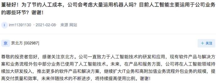 2月20日,京北方在互动平台上表示,公司一直致力于人工智能技术的研发和应用,现有软件产品与解决方案和业务流程外包中部分业务已使用了人工智能技术。未来,在产品和服务方面,公司将在人工智能领域持续加大研发投入,推出更多的软件产品和解决方案,继续扩大IT业务和高附加值业务流程外包业务的规模。